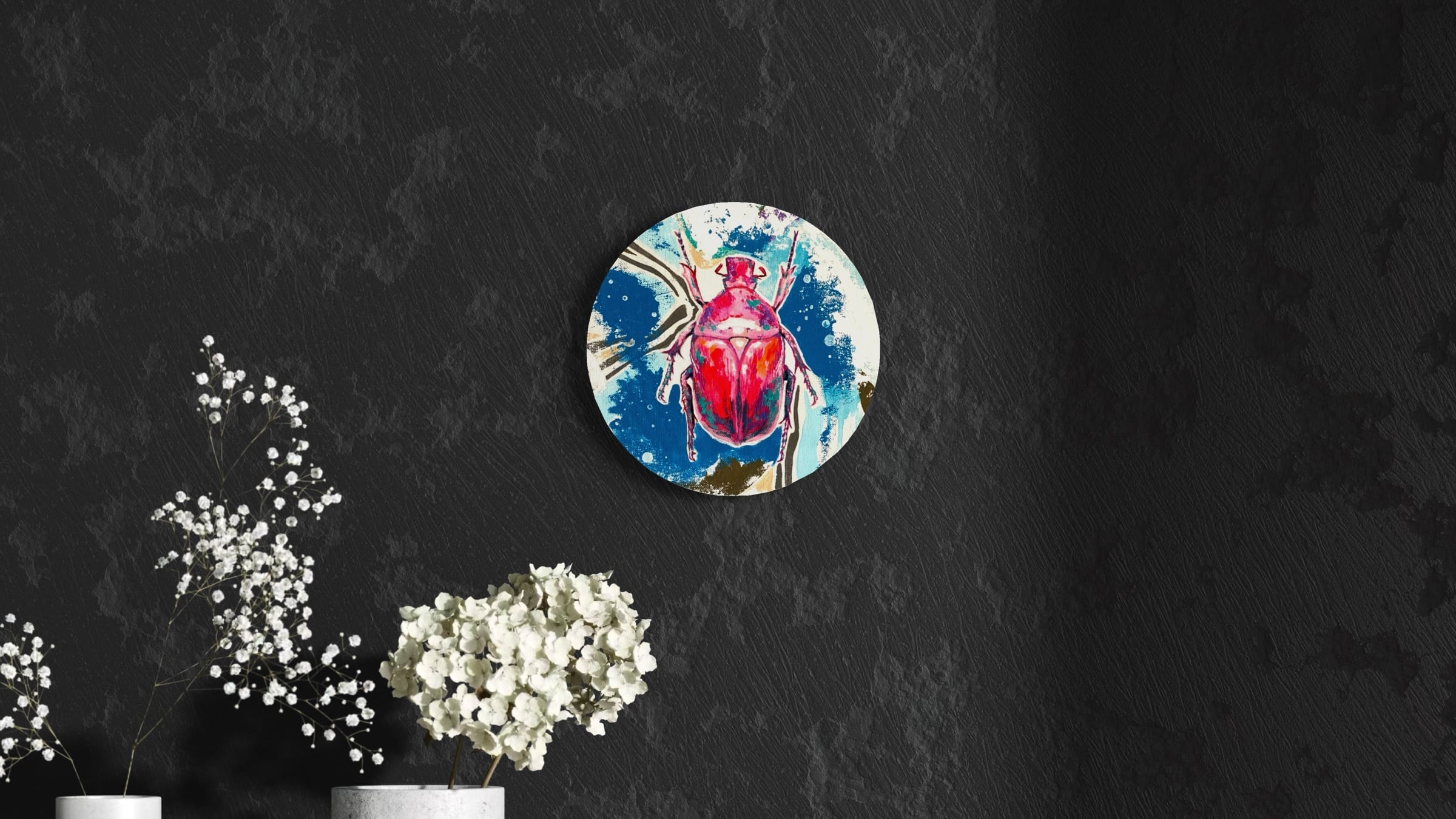アクリル絵の具使用 円形キャンバス (直径15cm・厚み1.5cm) 額縁なし 側面も着彩してあるので、そのまま飾っていただけます。 仕上げに画面保護材(ワニス)を使用しております。 こちらは原画となりますので、1点のみの販売です。